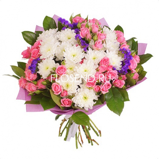 Букет из розовых роз и белых хризантем